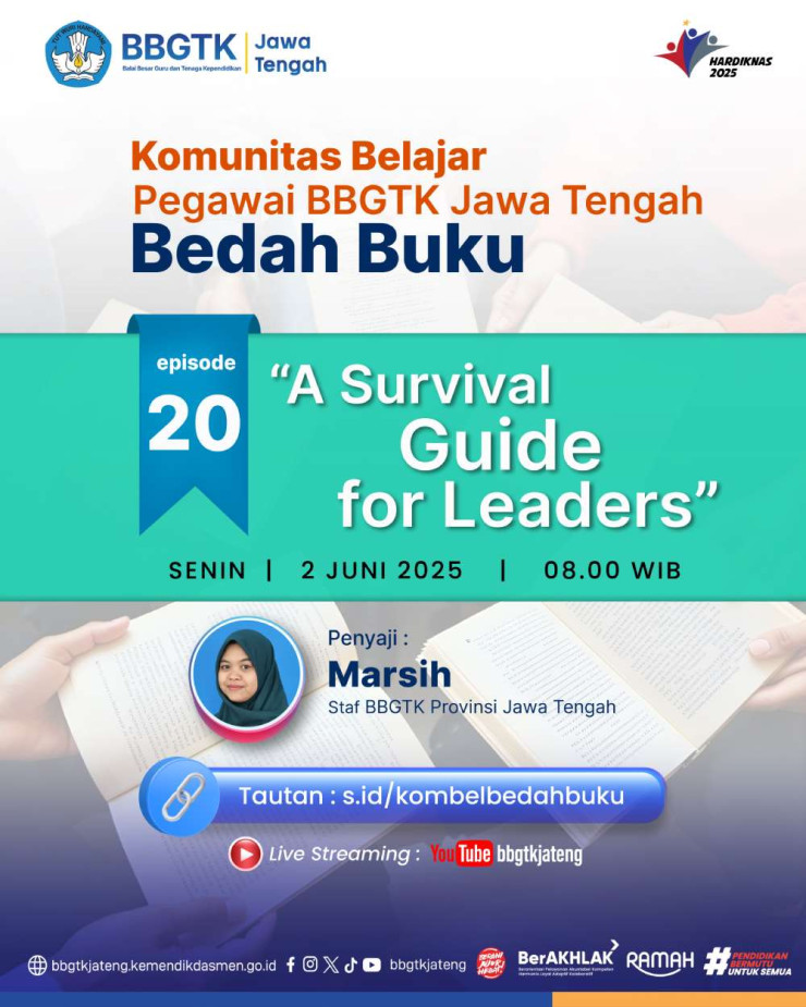 Ikuti Komunitas Belajar Bedah Buku Episode 20 - A Survival Guide for Leaders pada hari senin, 02 Juni 2025 pukul 09.00 WIB melalui tautan s.id/kombelbedahbuku