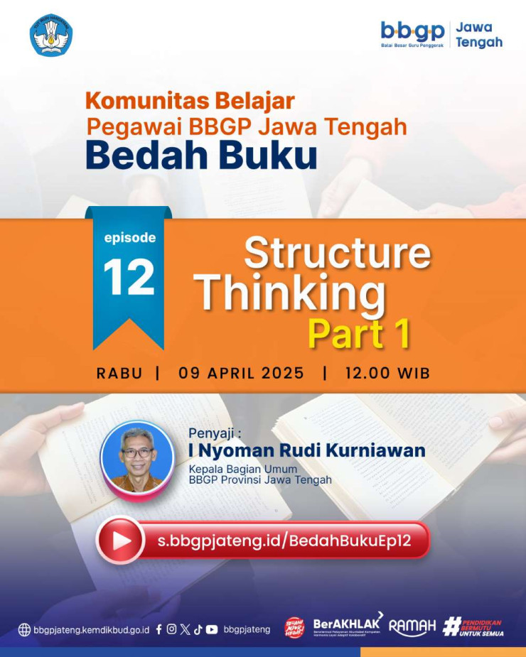 Pertemuan komunitas belajar bedah buku episode ini membahas tentang “Teori Piramida”. Sebuah konsep yang ditulis oleh Barbara Minto untuk menyusun presentasi atau laporan yang efektif dan efisien, terutama dalam konteks komunikasi dengan pimpinan atau audiens yang memiliki waktu terbatas. I Nyoman Rudi menjabarkan komponen teori piramida yang terdiri dari Pesan Utama, Argumen Pendukung, dan Data Pendukung, struktur SCQA, dan contoh penerapan pada kasus yang terjadi di lingkup pendidikan. Pertemuan dilanjutkan dengan diskusi bersama dan tanya jawab. Sebagai latihan praktik, peserta komunitas belajar menyusun presentasi dengan teori piramida terkait isu terkini, dan akan dibahas pada pertemuan selanjutnya.